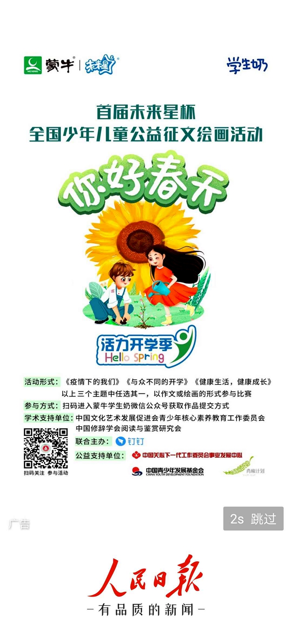 蒙牛未来星学生奶方面表示,本次活动希望从少年儿童视角出发,为全社会营造战疫必胜的信念,也愿孩子们能在疫情下有所思考与成长,早日恢复正常的学习与生活。
