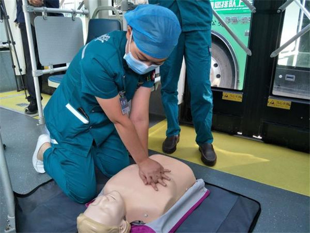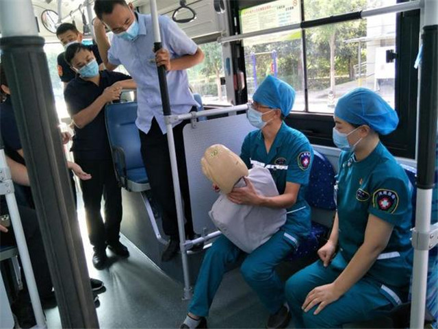 9月11日上午,郑州公交三公司的车长们在医院急诊科医生和护士的指导下,在车厢中,开展了一场别开生面的应急救护与疫情防控知识学习培训活动,车长们在各位医护老师的指导下,现场进行了心肺复苏急救模拟演练。
