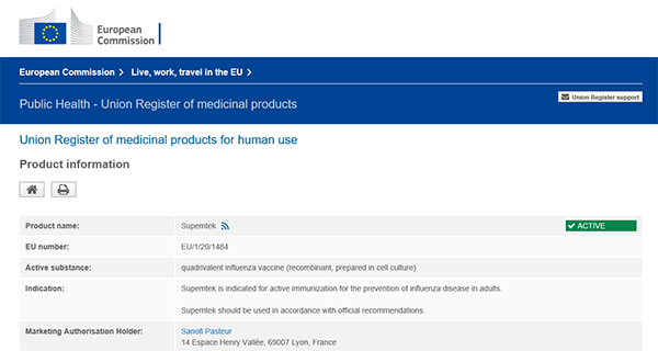 11月18日,赛诺菲巴斯德重组四价流感疫苗获欧盟委员会上市批准,在欧盟27个成员国及英国、挪威、冰岛和列支敦士登上市,用于18岁及以上成人的流感预防。这款新一代流感疫苗是全球首个且目前唯一获批的重组四价流感疫苗。该疫苗在欧洲获批商品名为Supemtek,此前在美国获批时商品名为Flublok Quadrivalent。