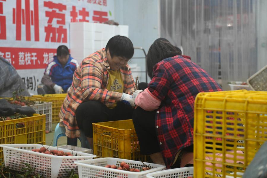 6月18日,果农在广东茂名高州的一个冷库中打包荔枝。新华社记者 肖恩楠 摄