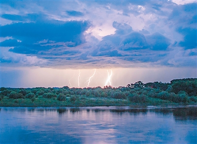 7月21日,在黑龙江省伊春市嘉荫县拍摄的积雨云和闪电。