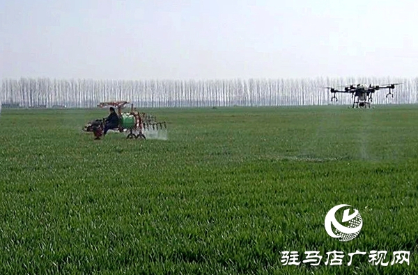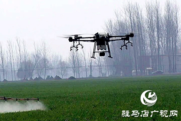 2月23日,在平舆县高杨店镇王阁村委马桥村的田间地头看到,一架无人机正由飞手操控着在绿油油的小麦上空匀速前行,将除草剂均匀喷洒在下方的麦田。