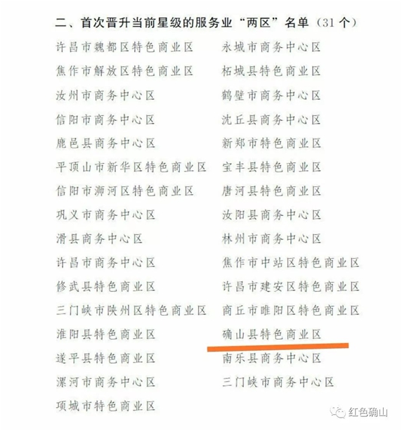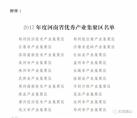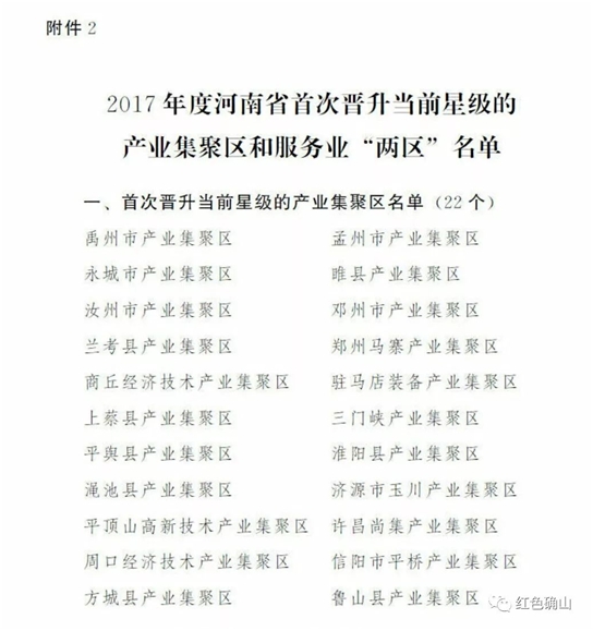 近日,省政府发布通报,授予郑州经济技术产业集聚区等20个产业集聚区“2017年度优秀产业集聚区”称号,各奖励500万元;对首次晋升当前星级的禹州市产业集聚区等22个产业集聚区和许昌市魏都区特色商业区等31个服务业“两区”,各奖励300万元。确山县特色商业区榜上有名,获奖300万元。