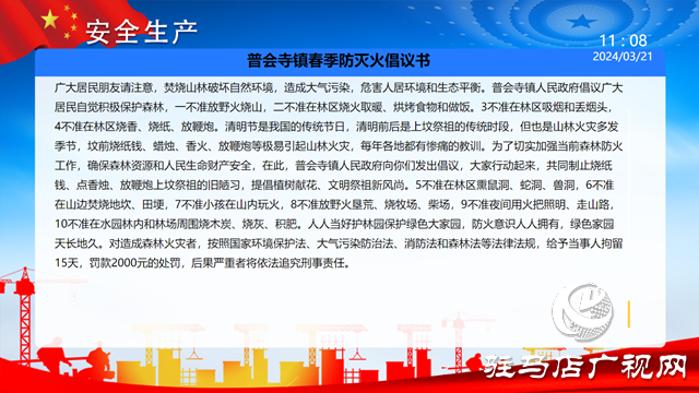 线上通过“智慧普会寺”、微信群、聚焦案例宣传;线下通过悬挂条幅、村级广播聚焦森林防火法律法规和安全常识宣传。两种渠道双轨并行,从宣传阵地、舆论引导、反面警示等多方面精心策划,提高群众对森林火灾的危害和引发森林火灾的法律后果的认识,全面增强群众防火意识。截至目前,悬挂条幅14条,发放宣传单800余份,广播2200余次,营造森林防火的浓厚氛围。(编辑 李宗文)