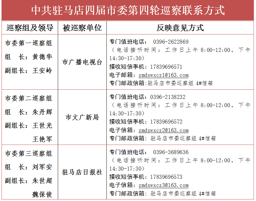根据市委统一部署,市委5个巡察组于12月18日分别进驻市委党校、驻马店日报社、市安监局、市文广新局、市广播电视台开展巡察。巡察时间30天左右。巡察期间,市委各巡察组均开通专门值班电话、邮政信箱、电子邮箱、接收短信手机,并在被巡察单位办公场所等地点设有市委巡察组征求意见箱,欢迎广大人民群众和社会各界反映情况。巡察进驻结束后,各种受理信访举报渠道统一关闭。