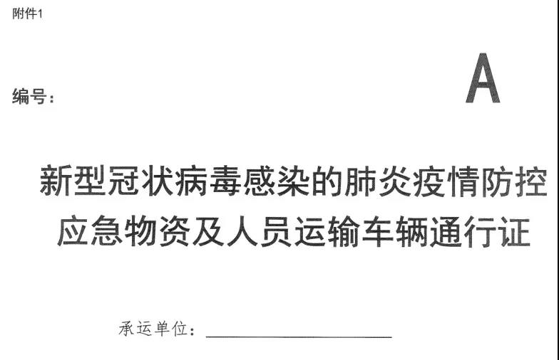 1.新型冠状病毒感染的肺炎疫情防控应急物资及人员运输车辆通行证(A证式样)