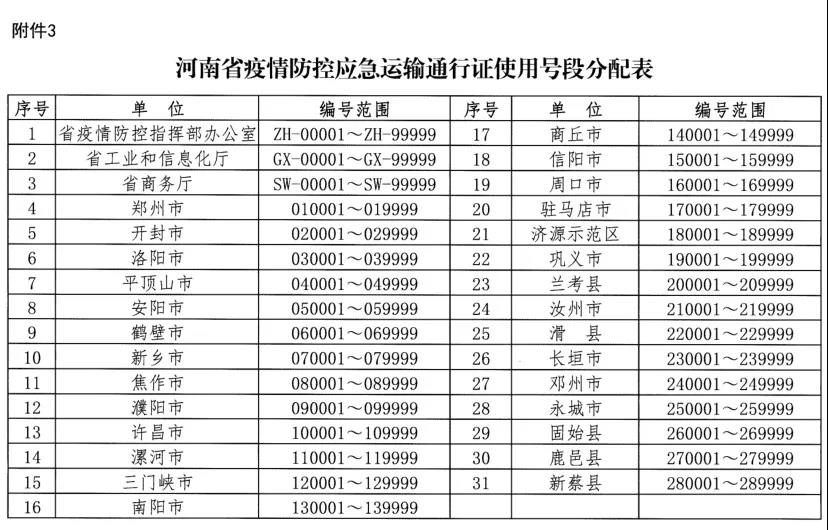 3.河南省疫情防控应急运输通行证使用号段分配表