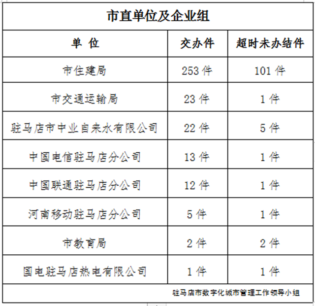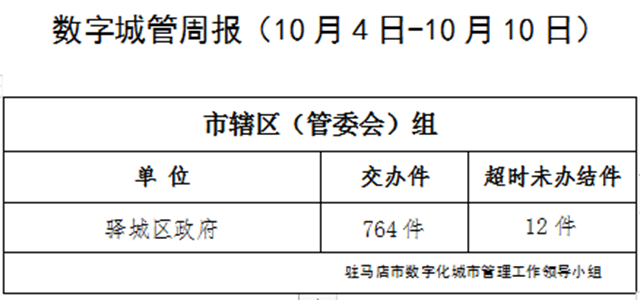2021年10月4日-2021年10月10日,驻马店市智慧城市服务中心通过采集员、网格员采集上报、视频抓拍、领导交办等途径受理各类城市管理案件3438件,本周应结案3412件,其中已结案3132件、超时未办结171件、因确权争议未处置案件共109件,结案率91.79%,所有案件均通过数字城管系统派遣交办至18个联动单位,经采集员核查,截至10月10日18时,存在超时未办结案件的单位共9个,详细情况如下: