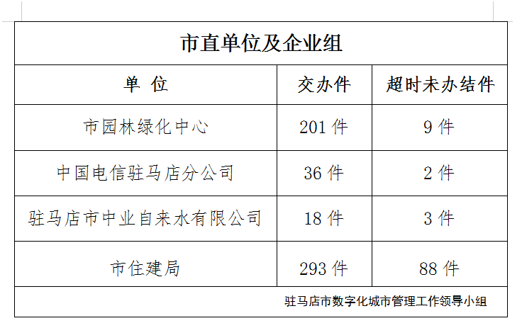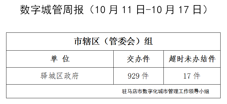 2021年10月11日-2021年10月17日,驻马店市智慧城市服务中心通过采集员、网格员采集上报、视频抓拍、领导交办等途径受理各类城市管理案件4263件,本周应结案4189件,其中已结案3776件、超时未办结119件、因确权争议未处置案件共294件,结案率90.14%,所有案件均通过数字城管系统派遣交办至18个联动单位,经采集员核查,截至10月17日18时,存在超时未办结案件的单位共5个,详细情况如下:
