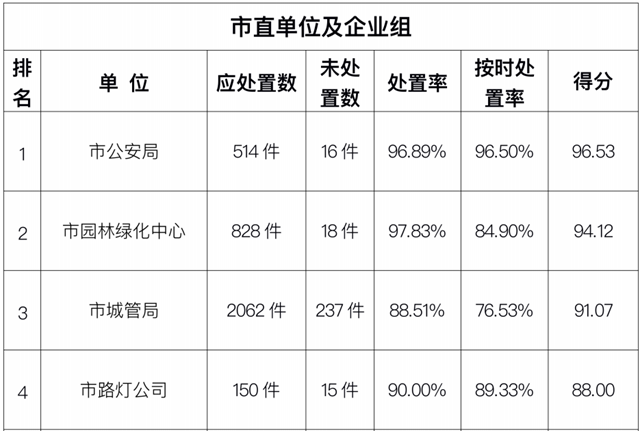 2022年3月份,驻马店市智慧城市服务中心通过采集员上报、视频抓拍、领导交办等途径受理各类城市管理案件17350件,其中本月应结案16248件,已办结14900件,超时未办结833件,综合处置和协同处置未办结515件,结案率91.70%。所有案件均通过数字城管系统派遣交办至4个区及18个市直联动单位,现将3月份市中心城区数字化城市管理工作考评排名情况通报如下: