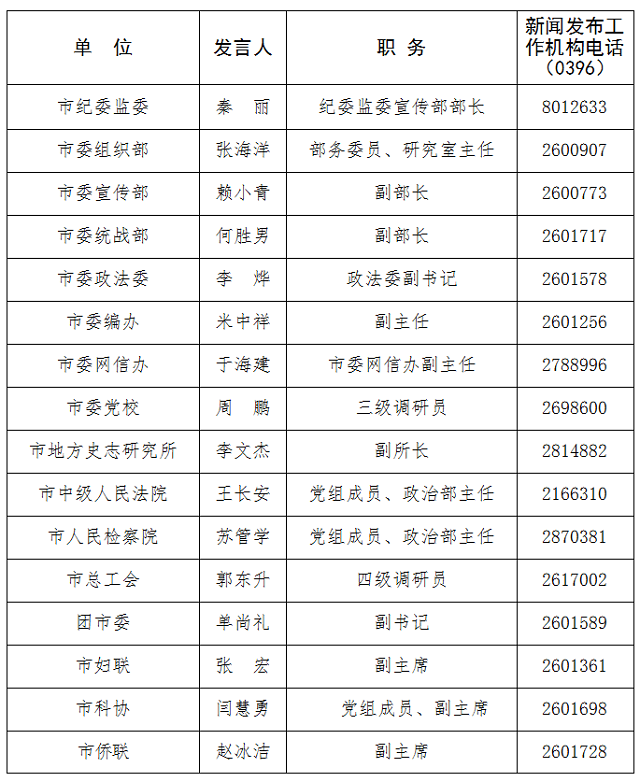 驻马店市有关单位新闻发言人名单及新闻发布工作机构电话