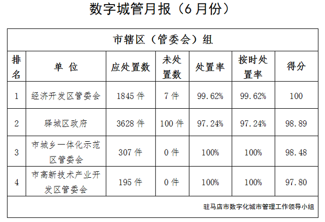 2022年6月份,驻马店市智慧城市服务中心通过采集员上报、视频抓拍、领导交办等途径受理各类城市管理案件17452件,其中本月应结案16580件,已办结15343件,超时未办结792件,综合处置和协同处置未办结445件,结案率92.54%。所有案件均通过数字城管系统派遣交办至4个区及18个市直联动单位,现将6月份市中心城区数字化城市管理工作考评排名情况通报如下: