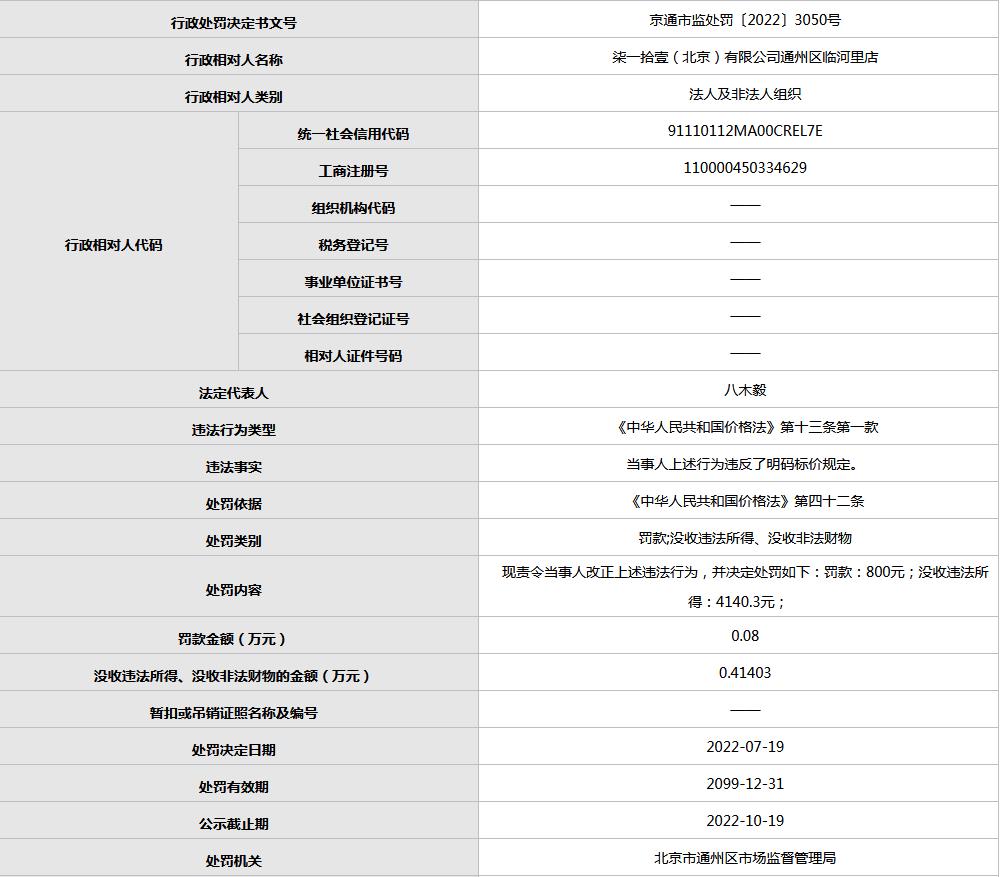 中新网7月25日电 据北京市场监督管理局网站消息,近日,柒一拾壹(北京)有限公司通州区临河里店因违反明码标价规定,被北京市通州区市场监督管理局罚款800元,并没收违法所得4140.3元。(中新财经)