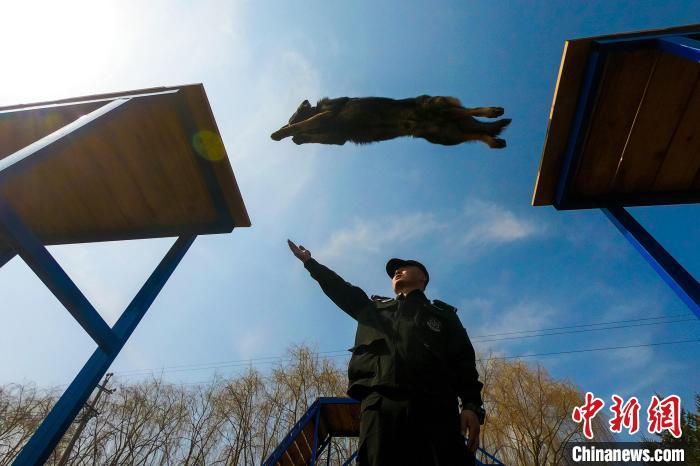 近日,在吉林通化边境管理支队榆林边境检查站训练场上,训导员与警犬正在进行训练。该检查站近期正在开展警犬春季复训,包括车辆搜爆、箱包搜毒、指令服从、扑咬放口、场地障碍等十余项科目。