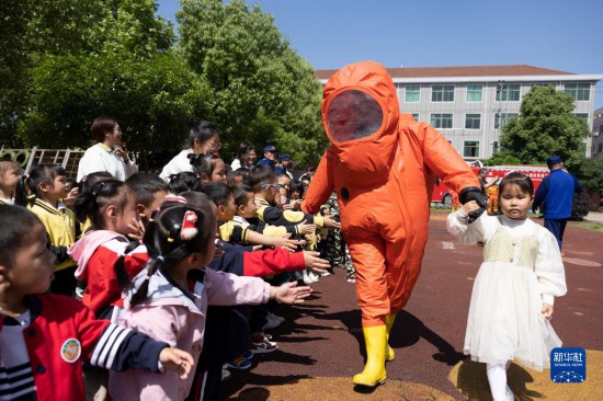 5月9日,浙江省诸暨市姚江镇应急消防救援站的消防员(右二)与该镇直埠幼儿园的孩子们互动。
