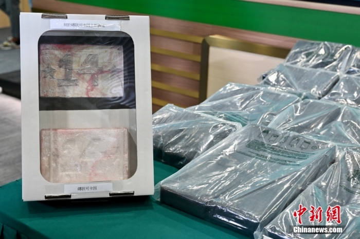9月13日,香港海关举行记者会通报,该海关日前在葵涌侦破一宗大型贩毒案件,检获约230公斤怀疑可卡因,估计市值约1.8亿港元。图为香港海关展示检获的怀疑可卡因。中新社记者李志华 摄
