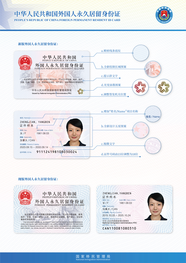 新版永居证在保持现版基本式样的基础上,新加入了体现国家标识的五星元素,优化美化版式布局,采用更为先进的防伪技术,改进提升了证件信息存储和应用管理服务手段。新版永居证升级技术、增强功能,新证启用后,持证人可通过互联网平台线上办理交通出行、生活消费、金融等私人事务,将进一步便利持证人在境内工作、学习、生活。