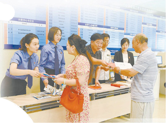 房山区检察院联合房山区人力社保局开展普法宣传活动,向群众发放预防求职诈骗宣传册。