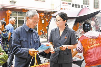 10月9日,福建省龙岩市永定区人民法院干警趁着当地群众赶集,在洪山镇街头支起了“普法小摊”,开展防范养老诈骗普法宣传活动。活动现场,法院干警向老人们发放防范电信诈骗、防范非法集资等宣传手册,现场讲解养老诈骗常见手段,增强老年人识骗、防骗意识和自我保护能力。蓝秀华 摄
