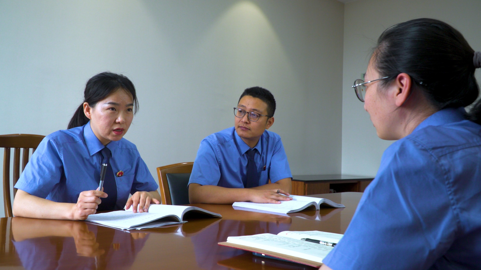 针对本案部分细节,承办检察官顾月月(左一)与同事展开讨论