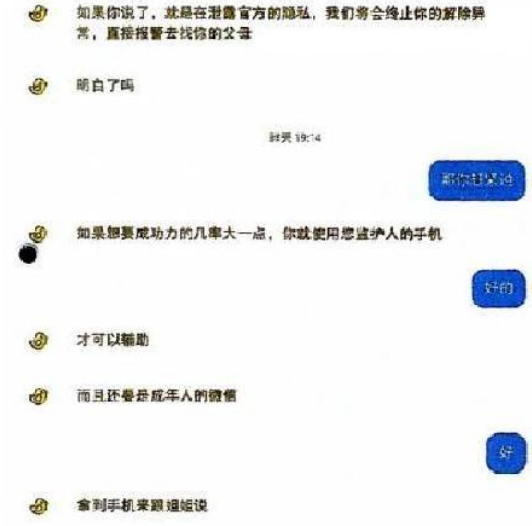这一提示为洪某某所制作,低龄被害人此时便会害怕,再加上王某某等人会要求其添加解除异常的专员——事实上为蔡某某的个人微信,蔡某某便与其视频,欺骗其“需按其指令操作,否则账户将自动获取其父母信息并报警”。