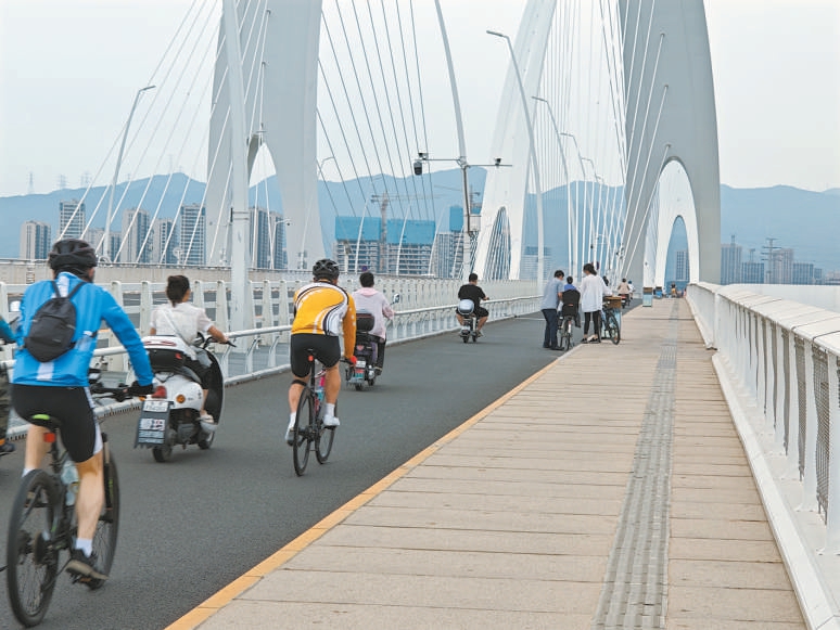 新首钢大桥上不少自行车车速较快,对周边市民安全造成影响。