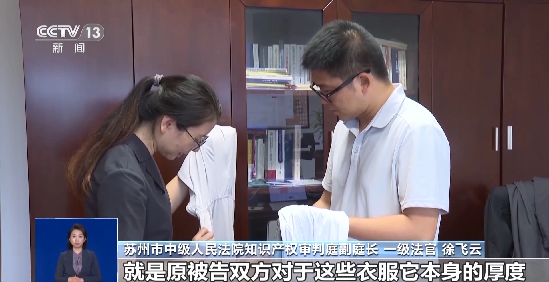 苏州市中级人民法院知识产权审判庭副庭长 一级法官 徐飞云:现场将品牌遮盖以后,交由双方当事人在庭审当中发表个人的感受,相当于是进行了现场试穿。原被告双方对于这些衣服本身的厚度以及是否具有冰感、凉感,它的厚薄等方面竟然形成了惊人一致的结论,证实了被告方对外发布的时候,它所讲的衣服比较厚,冰凉感不够,也就是说这些事实基本在庭审当中得到了验证。没有明显的背离客观事实,并且没有否定性以及贬低性的一些言论,所以我们认为这个行为尚且达不到商业诋毁的程度,所以对于商业诋毁的这些指控,我们进行了驳回。