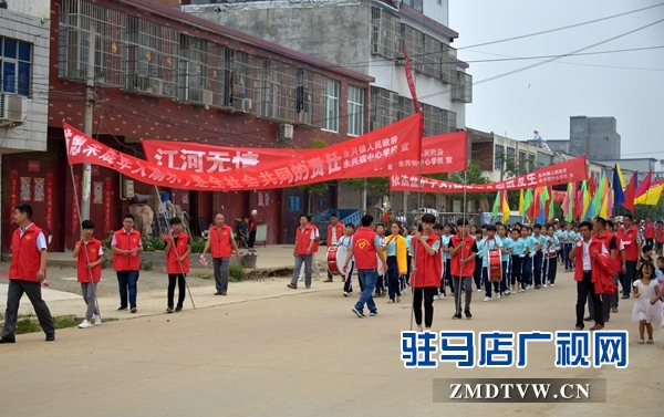 【驻马店广视融媒讯】(通讯员 张华)防范未成年人溺水是全社会共同的责任。6月30日上午,随着阵阵的鼓乐声,由正阳县永兴镇镇长陈广平、纪检书记郑勇辉,派出所干警、中心校长李立事、中心校有关校领导、各小学校长,中心小学腰鼓队、彩旗队、鼓乐队等上百人组成的“中小学生暑假防溺水安全教育”宣传队伍,排长队,举着彩旗、横幅,警车开道,沿街循环开展了声势浩大的“踩街”活动,成为众人驻足观看的一道靓丽的风景线。