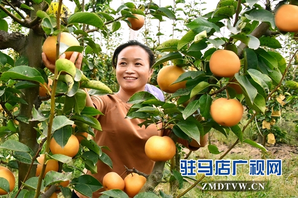 “这梨又大又甜,味道可口,很喜欢人。”10月9日,游人正在正阳县永兴镇“盛果农业种植合作社”梨园里采摘黄金梨,体验劳动收获的喜悦。近年来,该镇着重培育和发展黄金梨等生态林果产业,带动贫困人口增收、致富。(驻马店广视融媒通讯员 张华)