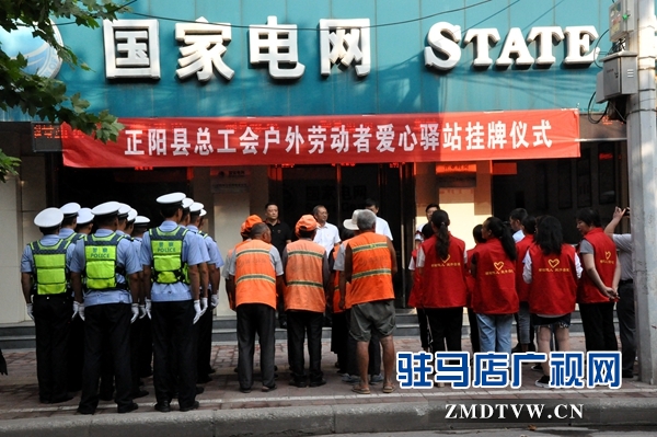 9月11日下午,正阳县总工会举行户外劳动者爱心驿站揭牌仪式。县级领导及环卫工人、交警、职工志愿者等户外劳动者代表参加揭牌仪式。这标志着由县总工会建立的10处户外劳动者爱心驿站全部正式投入使用。