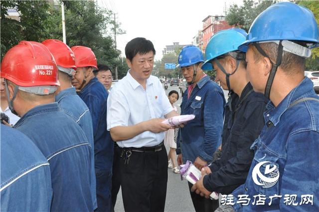 真阳街道办事处环卫工人承担着真阳街道民巷环卫保洁,持续高温,他们坚守一线,为城市保洁尽心尽力。在真阳街道办事处,隗正军与环卫工人一一握手,并送上毛巾等防暑降温等慰问品。