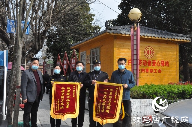3月24日下午,正阳县城市管理综合执法局冯云、肖顺章等人来到县城东大街户外劳动者爱心驿站前,将绣着“暖身暖心办实事·共建文明卫生城”“心系环卫送温暖·一心为民献真情”四行金色大字的两面锦旗送到县总工会党组副书记、副主席陈昊手中。