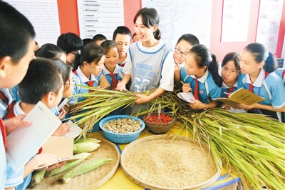 9月1日,江西省赣州市大余县池江镇池江中心小学教师在向学生讲解粮食知识。叶功富摄(人民视觉)
