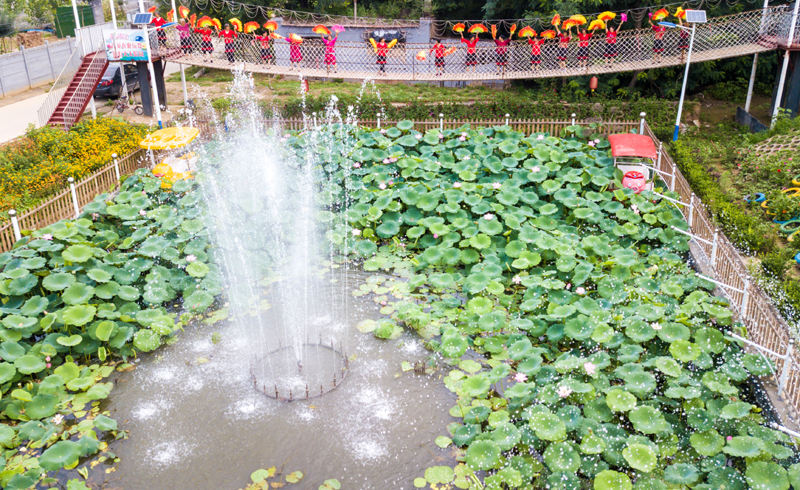 △2020年7月14日,河北省饶阳县王同岳镇王同岳村村民在废弃坑塘改造的小花园内排练节目。