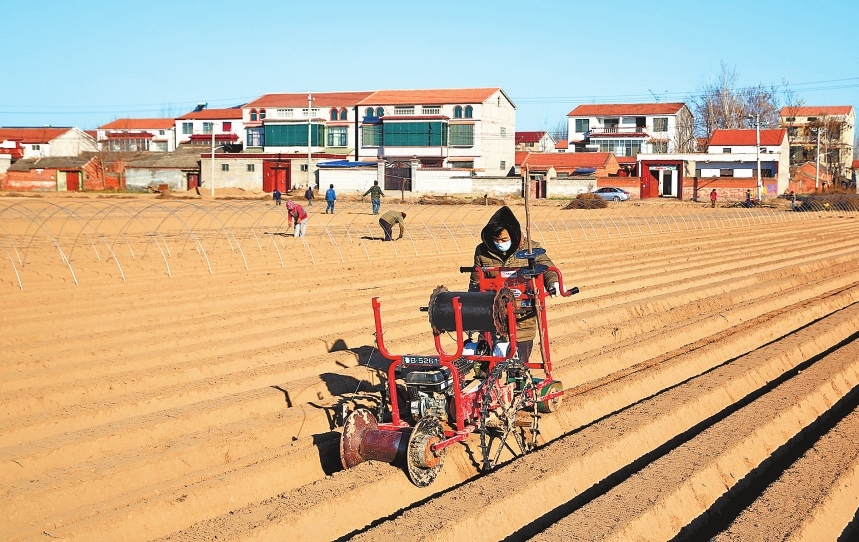 12月25日,扶沟县吕潭乡魏楼村村民在地里铺设大棚蔬菜滴灌带。黄金峰摄