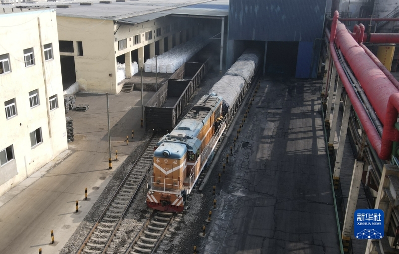 2月3日,满载化肥的货运列车驶出淮南市田家庵站货运装车点(无人机照片)。新华社记者 周牧 摄