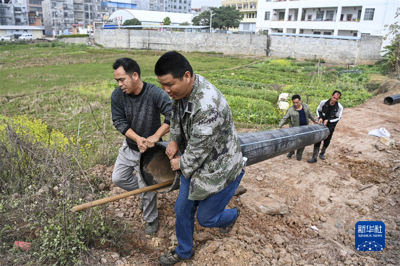 2月1日,广西兴业县沙塘镇的党员干部群众一起搬运输水管道。新华社记者 曹祎铭 摄