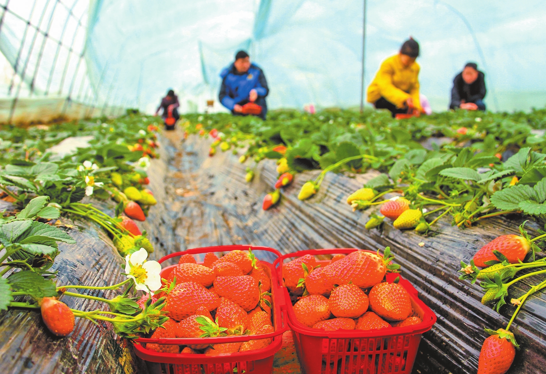 2月12日,南阳市卧龙区靳岗乡坡桥村草莓种植基地,农民在采摘草莓。近年来,该区通过发展“一村一品”特色农业,带动农民增收致富,助力乡村振兴。高嵩 摄
