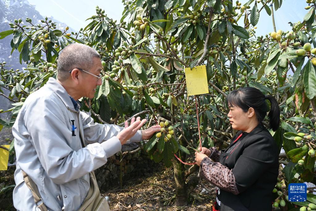 3月3日,云霄县农业农村局高级农艺师陈天佑(左)在吴素华的枇杷种植园进行技术指导。