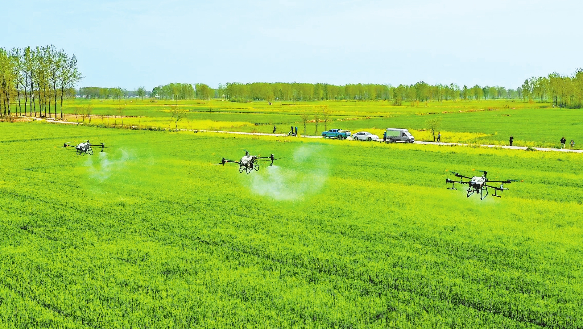 4月10日,在正阳县大林镇涂店村,大型植保无人机正在对小麦进行“一喷三防”作业。该县组织无人机600台,可确保全县小麦一周内全部防治一遍。高万宝 摄