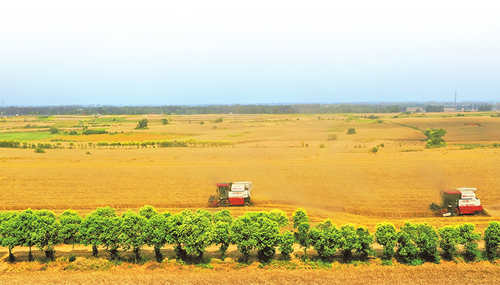 5月30日中午,连续5天连绵阴雨后,舞阳县的天终于放晴,3台履带式收割机也如约来到地头,谷勇辉踩踩泥地,当即拍板,“再晾个半天,明天就开收!”