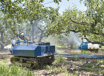 安徽省砀山县玄庙镇标准化梨园里,数台采用人工智能技术控制的多功能果园机器人在喷洒生物农药。