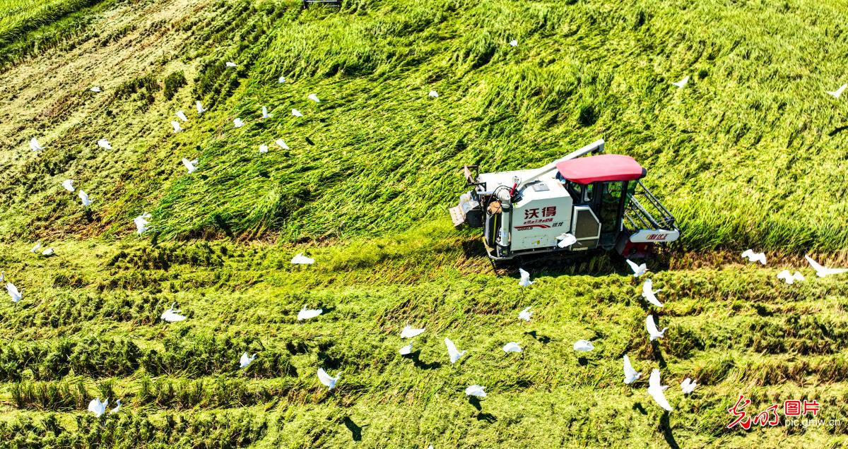2023年8月20日,安徽省芜湖市繁昌区平铺镇五里亭,种粮大户驾驶农机正在收割"再生稻",鹭鸟在收割的田间嬉戏、觅食,构成一幅人与自然和谐相处的生态丰收画卷。(鲁君元摄/光明图片)