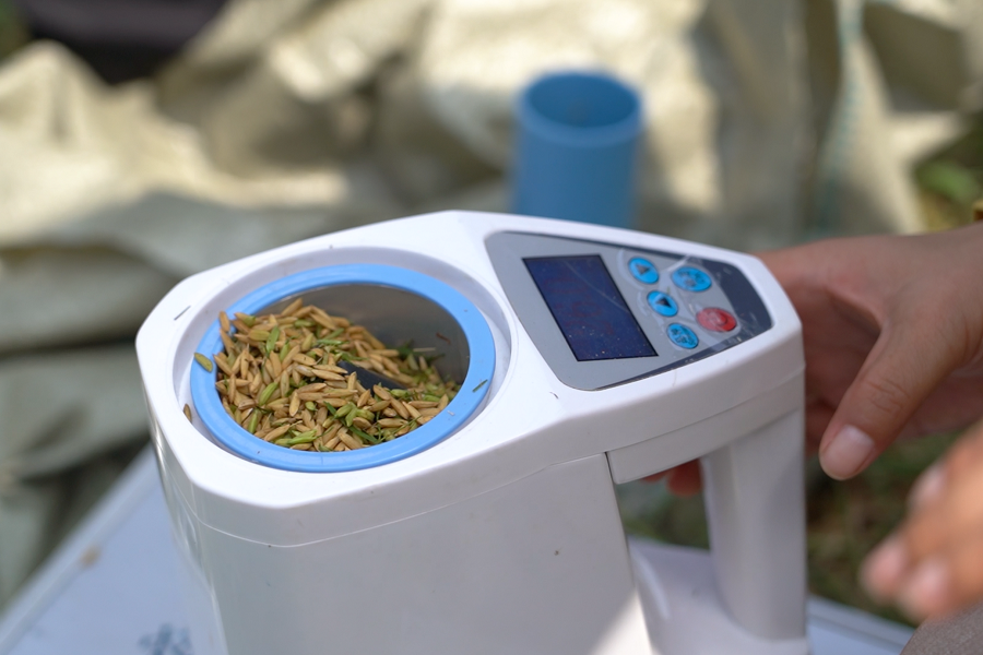 在江西省鄱阳县再生稻高产示范片,工作人员现场检测稻谷含水量。王凯丰 摄