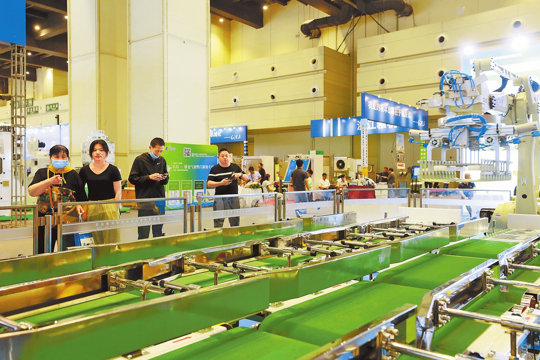 第五届中国粮食交易大会上粮油机械设备集中展示。图为高速码垛系统展示。本报记者 聂冬晗 摄