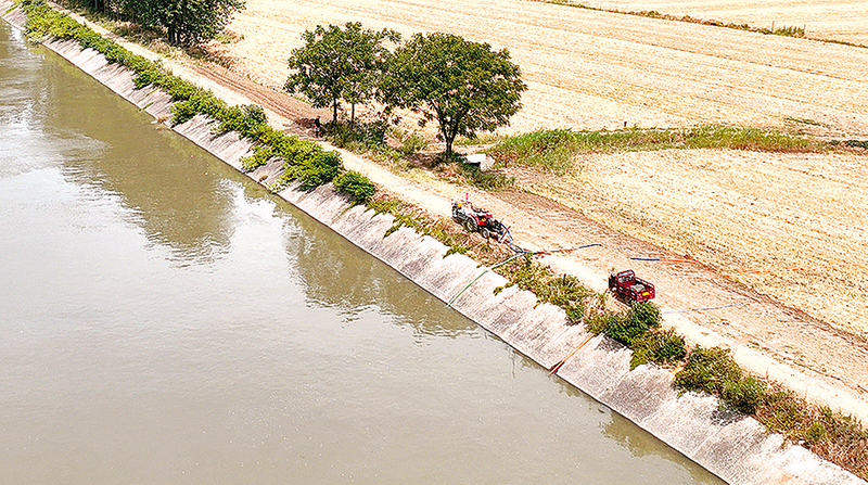 6月13日,在宿鸭湖水库下游的汝南县祝湾村田间,村民们正利用抽水泵抽取干渠清水,进行浇灌保苗。