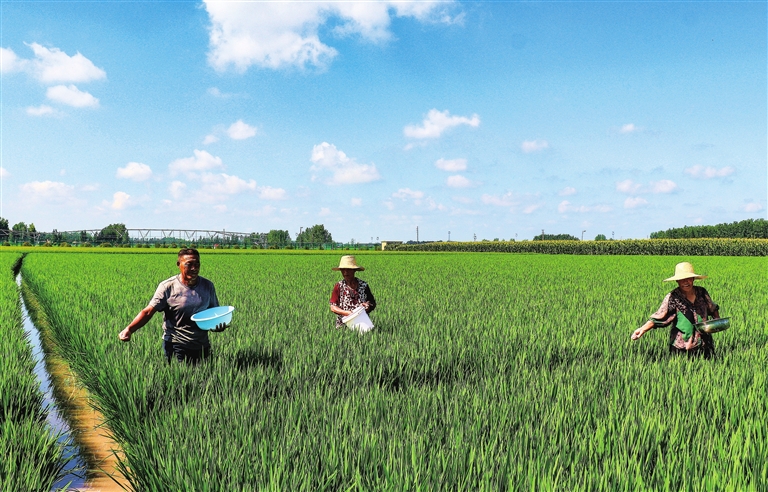 8月4日,河南省提质增产研究院的员工在扶沟县城郊乡水稻试验田撒施孕穗肥。近期高温高湿,该院加强水稻全生长期的水肥科学管控和病虫害防治,为稻农探索和总结水稻提质增产的标准化管理技术。谷志方 摄