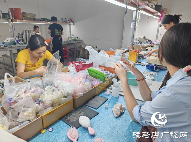 8月7日,在位于平舆县古槐街道小刘社区的平舆千艺工艺品厂手工加工作坊里,几十位留守妇女一双双巧手在案台上飞舞,她们正娴熟地将钻石镶嵌在茶杯、镜子等各种物品上,尽是一派辛勤繁忙的热闹景象。