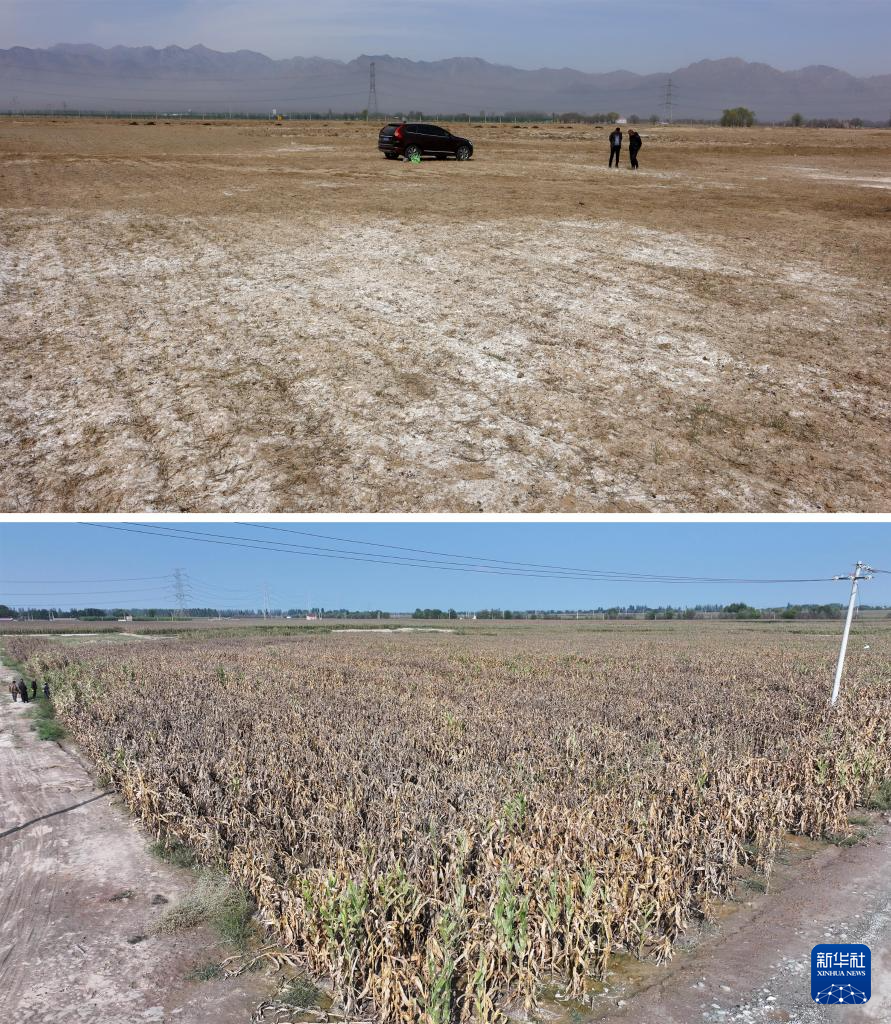 这是一张拼版照片。上图为2022年4月4日拍摄的宁夏农垦暖泉农场未经改良的盐碱化土地原貌(新华社发)。下图为北方民族大学杨国平教授通过微生物方式治理过的盐碱地上玉米的生长情况(9月21日摄,无人机照片,新华社记者杨植森摄)。