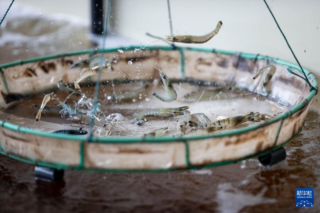 工作人员在宁夏银川市贺兰县常信乡谭渠村的蓝湾生态园南美对虾养殖基地查看南美对虾生长情况(9月19日摄)。
